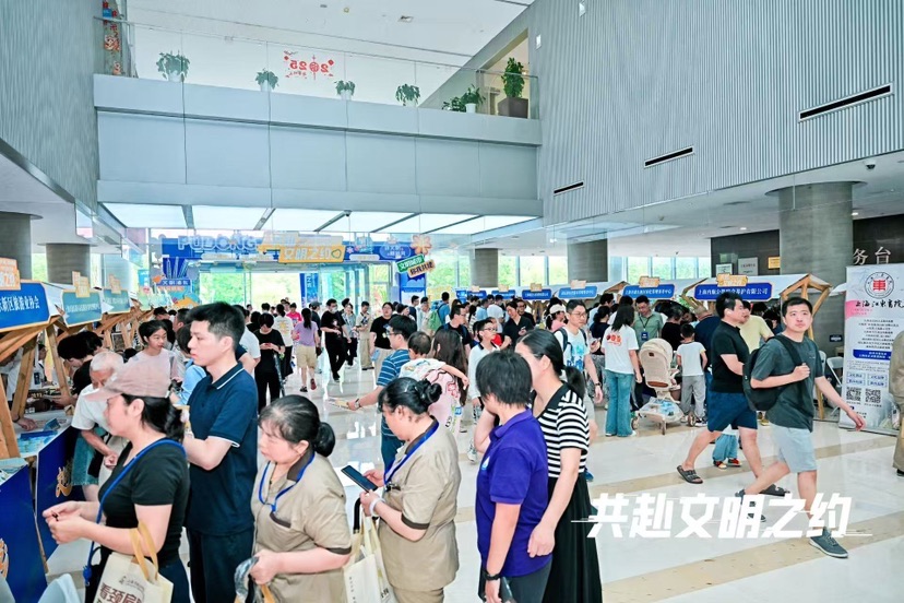 与殿堂级歌剧交相辉映的,是同期在浦东图书馆一楼火热举行的“共赴文明之约”市集。市集精心设置了“便民服务”、“文化守艺”、“好物公社”、“科普探秘”四大主题区域,40余家文明单位各展所长,不仅为市民提供便民服务,同时也发布文旅商体展信息、展销优质产品。