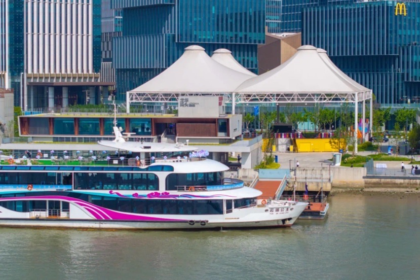 主持人带着粉丝们登上了一艘游船,虽然船并未真正启航,但大家已经感受到了江风的惬意。他介绍道,未来龙华码头将推出更多专题旅游航线,如宠物游、体育游、艺术游等,让游客们可以在这里体验到更多元化的旅游项目。龙华码头于今年的中国旅游日(5月19日)正式启用,这座承载历史记忆的工业遗存完成了它的华丽蝶变。