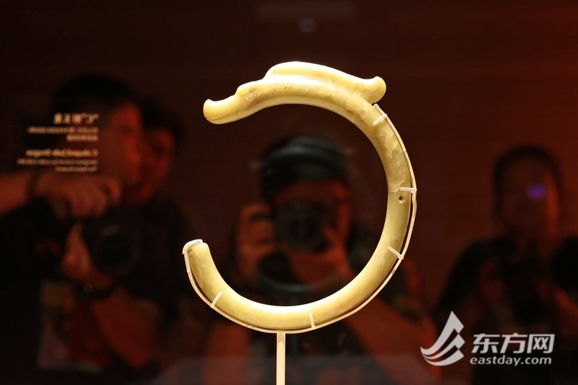 故宫博物院藏的红山文化“C”型玉龙和辽宁省文物考古研究院藏的红山文化玦形玉龙这次“出差”来到上博,堪称是本次展览的“镇馆之宝”。展览通过“龙出辽河”“龙行红山”“龙衍九州”三个单元阐释红山文化信仰统一、礼制初成的古国面貌,探究其如何走出一条独具特色的文明发展之路,实证中华民族五千多年的文明史,回答“何以中国”的历史之问。