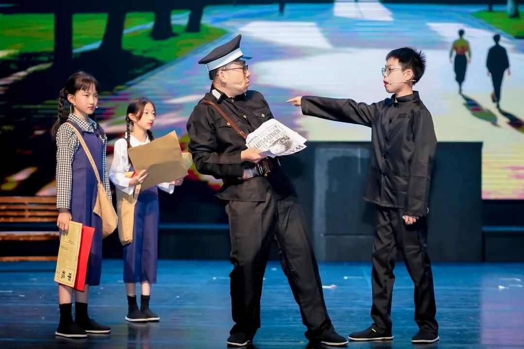 经过近半年的浸润式研学与创造性实践,学生们将学习成果凝结成了这部原创的《童声嘹亮》舞台剧。剧目以四首不同时代的校歌巧妙串联,生动演绎了向阳小学(及其前身位育小学)与时代同频共振的四个关键篇章:从1932年淞沪抗战烽火中艰难创校的位育学子与报童结下的珍贵情谊和《卖报歌》的诞生;到1946年地下少先队英勇守护进步刊物《新少年报》(后化名《青鸟》),位育学子化身追求光明的“小青鸟”为上海解放贡献力量;再到1971年正式更名“向阳小学”后,其倡导“爱生”理念、寓教于活动的特色教育实践成为经典电影《闪光的彩球》的创作源泉;直至2022年“双新”课改春风吹来,学生们走出校园,在社会实践的大课堂中深化对知识价值与学习意义的理解,呼应着新时代教育改革的方向。