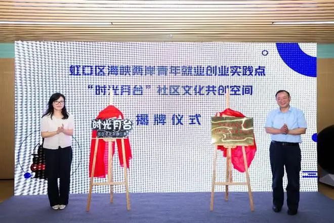 现场,虹口区台办主任李国庆、广中路街道党工委书记周静分别为“虹口区海峡两岸青年就业创业实践点”和“时光月台”社区文化共创空间揭牌。
