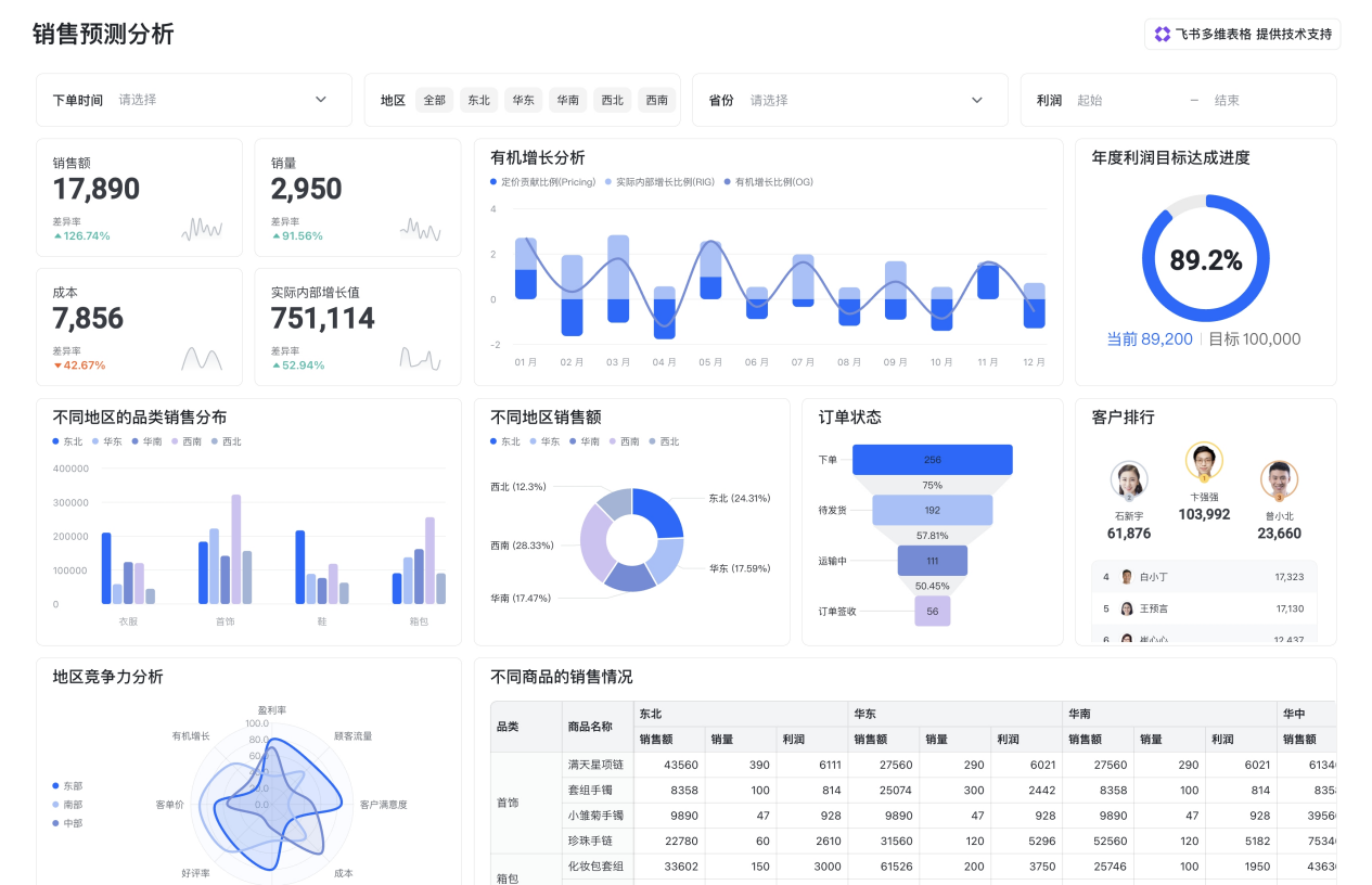 以一个销售仪表盘为例,用户可通过切片器功能一键创建数据切片,立即看到对应销售经理,在特定销售日期下成单金额大于X的所有数据。也能通过“Top N” 功能,展示销售额较高的地区分别有哪些、某个产品在哪些地区卖得最好等等。