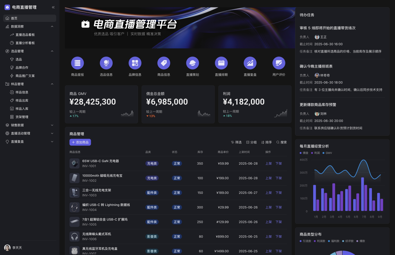 △一个使用多维表格应用模式搭建的电商直播管理平台