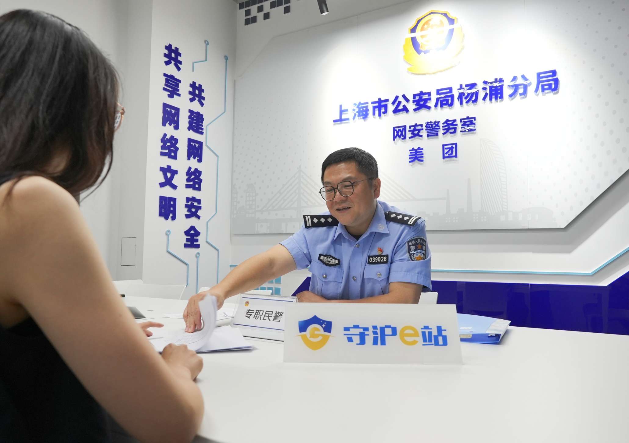 图为杨浦公安分局网安支队民警张哲钦在美团网安警务室为企业负责人解读政策
