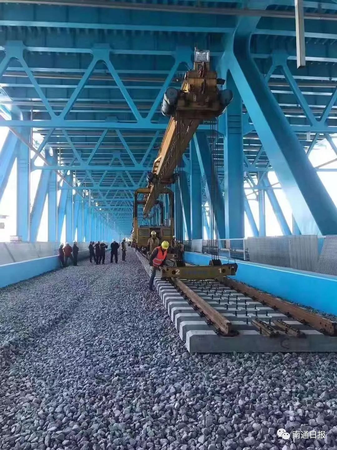 沪通长江大桥下层铁路桥开始铺轨,包含沪通铁路、盐通高铁