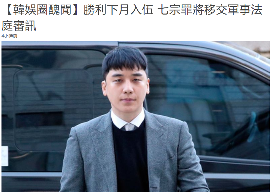 1月15日,据港媒报道,胜利在躲过了昨天的拘捕令之后,马上又曝出了入伍的新闻,据悉胜利将会在下月中入伍,而面临的七宗罪也将会在队伍中得到审判,不过审判要放在军事训练之后,也就是说胜利的案子又可以被延期很长一段时间。