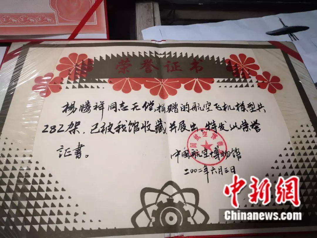 中国航空博物馆收藏杨腾祥的飞机模型后,给其颁发证书。