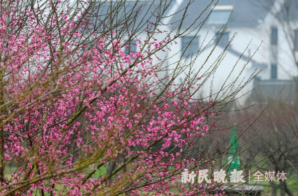图说:金山花开海上生态园梅花与黑瓦白墙相互映衬,宛如一幅水墨画。新民晚报记者 陶磊/摄