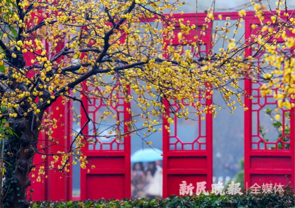 图说:世纪公园内蜡梅盛开,在古色古乡的红色装饰门映衬下,透着浓浓的年味。新民晚报记者 陶磊/摄