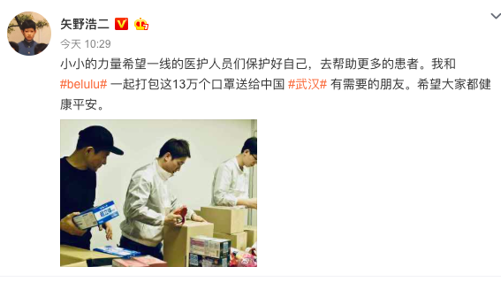 日本籍明星矢野浩二捐赠13万个口罩 妻子系重庆人