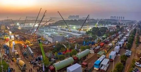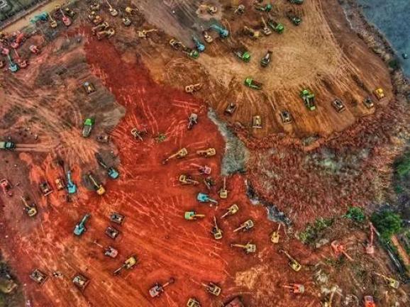 1月24日,项目入场挖机95台,推土机33台,压路机5台,自卸车160台,160名管理人员和240名工人集结完毕,并组建起2000人的后备梯队。为了加快进度,施工人员的年夜盒饭都是在工地上吃。除夕当天,施工方累计平整全部场地5万平方米,相当于7个足球场大小,开挖土方15万立方米,足以填满57个标准游泳池。