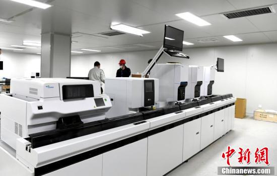 武汉雷神山医院由中南建筑设计院集团公司设计,武汉地产集团代建,中建三局承建。医院位于江夏区黄家湖,整体参照战地医院形式,采用模块化设计,主要包括医疗用房区、医护保障区、医疗辅助区。总用地面积约328亩,建筑面积7.99万平方米。图为武汉雷神山医院检验室。中新社记者 安源 摄