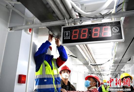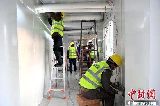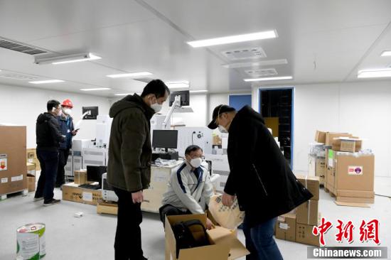 1月25日接到命令后,武汉市城建局立即组建现场指挥部,全力调集力量,以最严措施、最严作风、最严纪律坚决贯彻落实市防控指挥部的部署。图为武汉雷神山医院施工现场,工作人员正在安装检验室设备。中新社记者 安源 摄