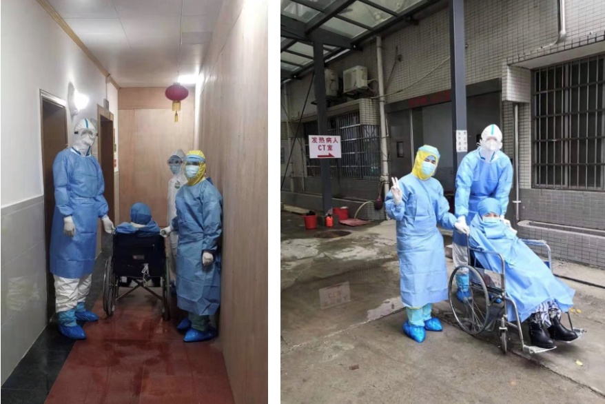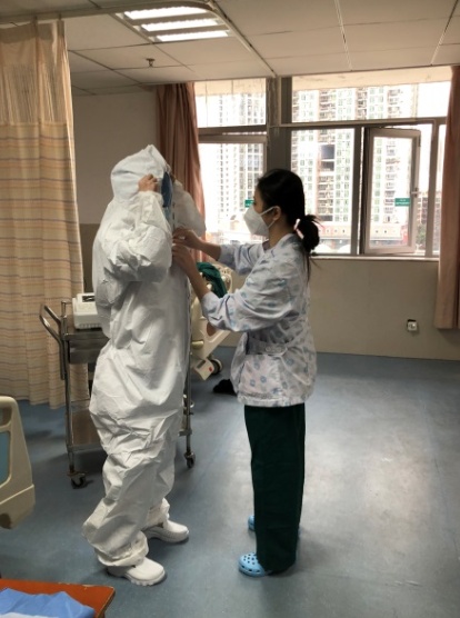 2020-02-04上午,一位从武汉返回广州的隔离病区的病人需要外出进行CT复查,护士按流程给患者做好防止病毒向外传播的防护,王昊博士承担了推轮椅护送病人检查的任务,一路上王昊博士与患者聊天,指导患者放松心情,并进行疾病健康教育,患者顺利完成CT检查。
