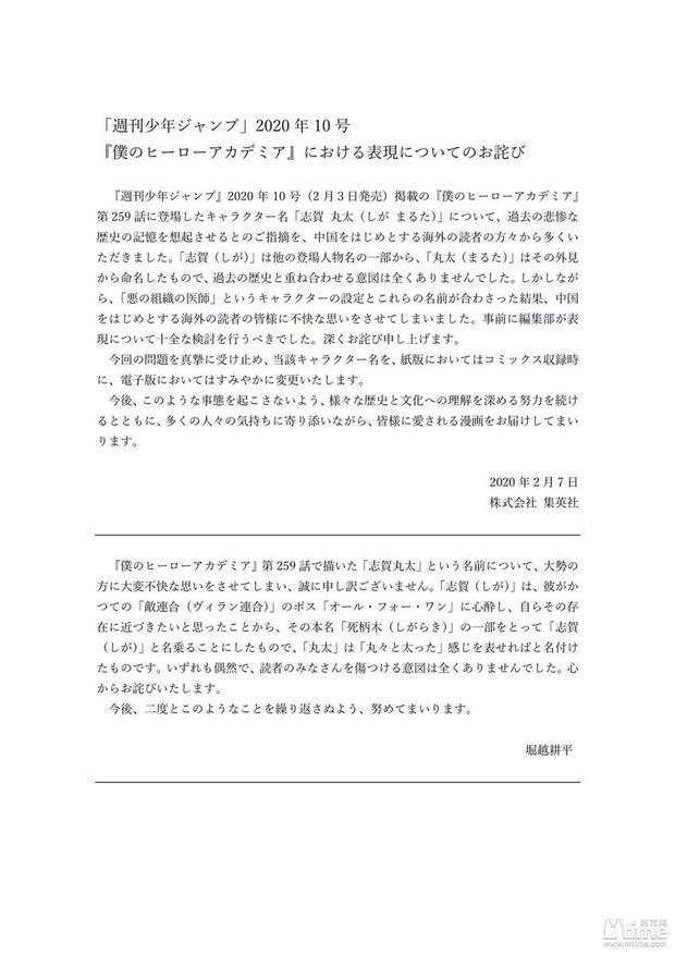 时光网讯针对日前《我的英雄学院》角色名字不当的争议,漫画作者堀越耕平以及《周刊少年JUMP》出版公司集英社发表致歉声明。