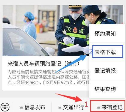 菜单页:“来宿登记”-“表格下载” ,跳转至表格下载地址,下载《来宿车辆人员预约通行申请表》。