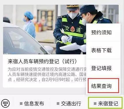 在“宿迁交通”微信公众号菜单页“来宿登记”— “结果查询”。