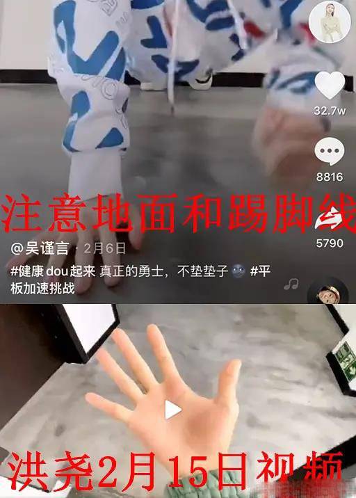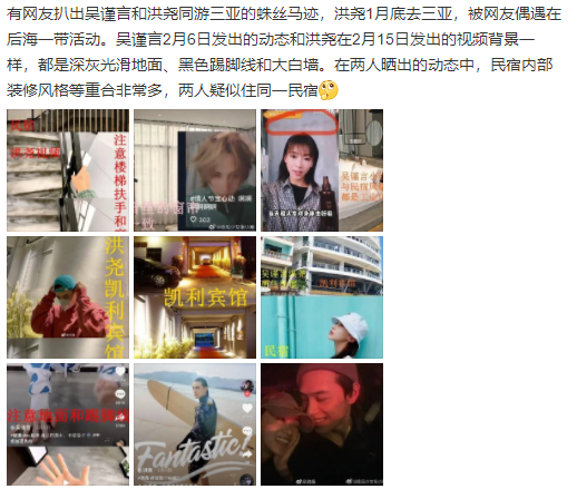 福尔摩斯网友们发现在2月5日,吴谨言录制完元宵晚会之后,就飞到了三亚,从2月6日吴谨言晒出的视频动态中,可以看到地板是深灰色、光滑面的,大白墙和黑色踢脚线,2月15日,洪尧晒出的动态里,地板墙壁和吴谨言此前动态里的背景一样。