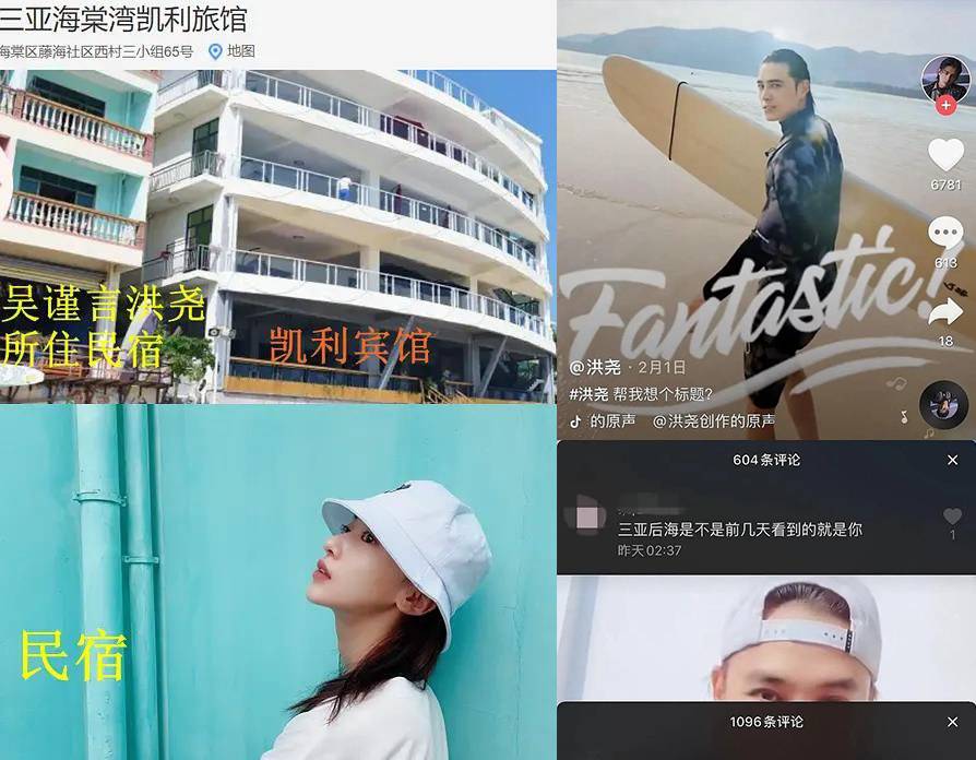 从洪尧更新的视频里,能看出住的是工业风民宿,有网友根据三亚当地的实际情况,找到了这家民宿,阳台很明显是蓝色的墙面,这一点和吴谨言晒出的自拍照背景一模一样,甚至连下水管道都没有差,基本可以断定吴谨言就是住在这里。