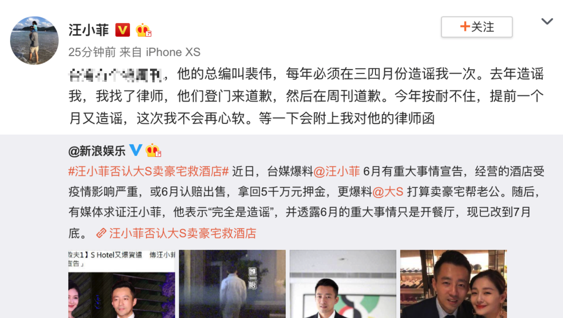 2月26日,汪小菲针对台媒爆料经营的酒店或6月认赔出售及大S卖豪宅的传闻作出回应。他发文指控台湾某周刊总编辑,每年三四月份都会造谣其酒店经营事项。“去年造谣我,我找了律师,他们登门来道歉,然后在周刊道歉。今年按耐不住,提前一个月又造谣,这次我不会再心软。等一下会附上我对他的律师函。”
