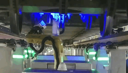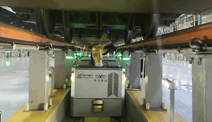 动车组智能检测机器人的机械手臂十分灵活,前端有高清摄像头,可伸入车底各部位进行探测。