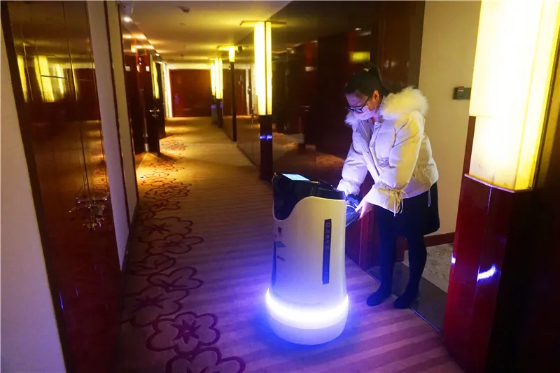 客人打开房门,在“东东”的语音提示下,操作顶部触摸屏,便可取走物品。“东东”非常礼貌地跟顾客说完“再见”,便转身回到出发地点,全身消毒后,静静等待下一次服务任务。