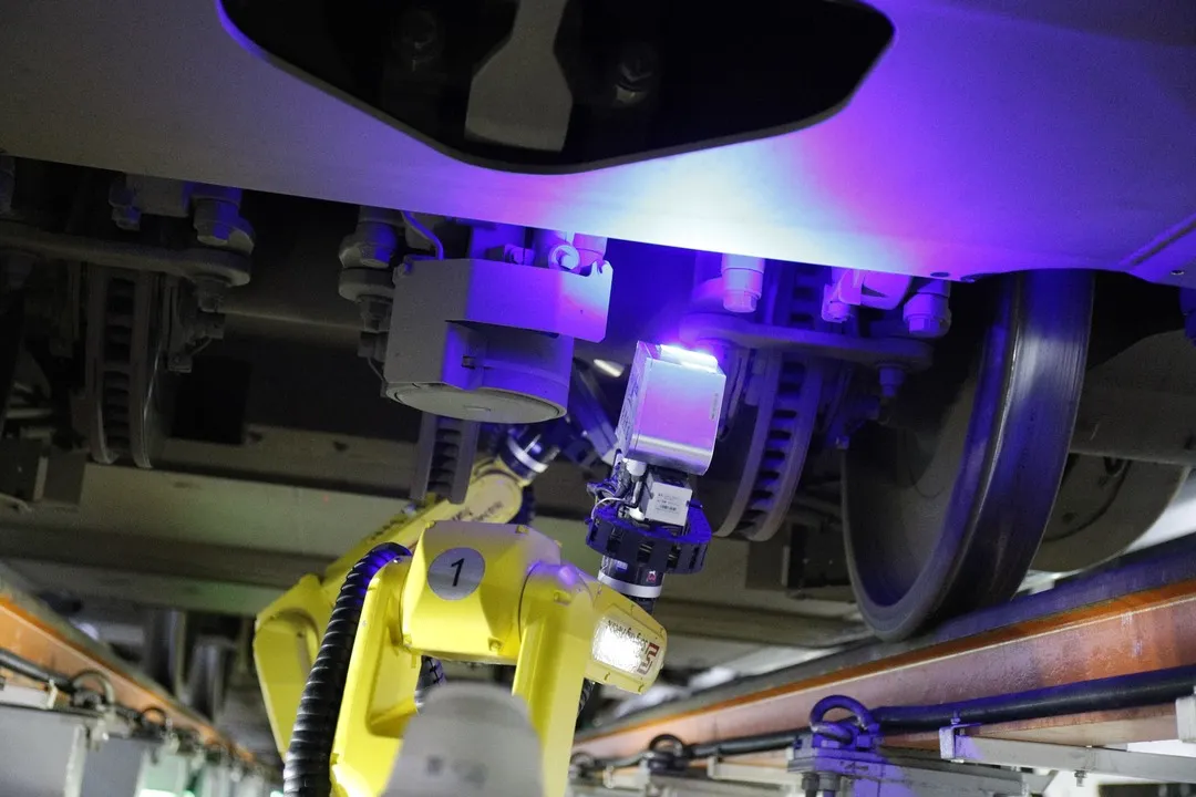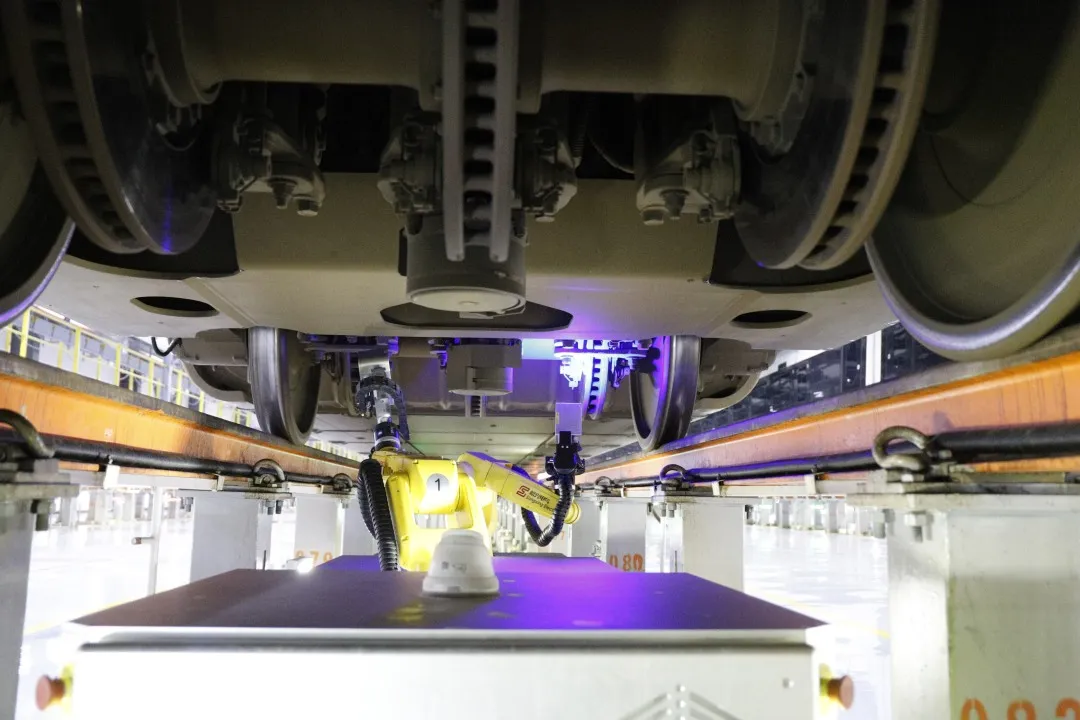 借助“眼睛”“大脑”和“手臂”及“双脚”的精准配合,每一列动车数千个部位都被有效纳入自动化检测,一列8编组动车检修时间从120分钟缩短到60分钟。
