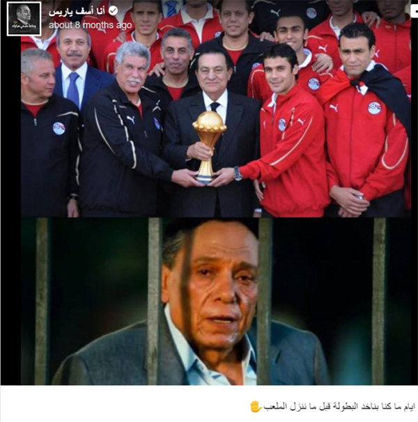 于是,对穆巴拉克时代的怀念开始作为一种对埃及现状不满的象征出现,即使人们也承认埃及目前的经济困境是穆巴拉克时代积累的政策造成的。在社交媒体上,穆巴拉克曾经的语录和照片会被引用或者修改,埃及人以一种他们特有的自嘲来解读自身当下的困境。当通货膨胀的时候,他们会自嘲说从穆巴拉克下台后人们都开始乞讨了;当物价高涨的时候,他们会自嘲说穆巴拉克时期斋月都能囤更多货,过节过得更久;甚至当埃及国家足球队无缘非洲杯四强时,他们会自嘲说穆巴拉克时期的埃及队总能“躺赢”。