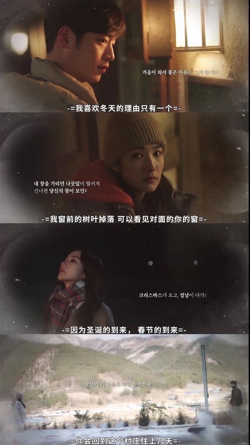 恩燮的暗恋故事,通通也以日记中诗歌的形式记录,“我喜欢冬天的理由只有一个/遮挡我窗前的树叶全部掉光/可以看见对面的你的窗/因为圣诞的到来/春节的到来/你会回到这个村庄住几天”。