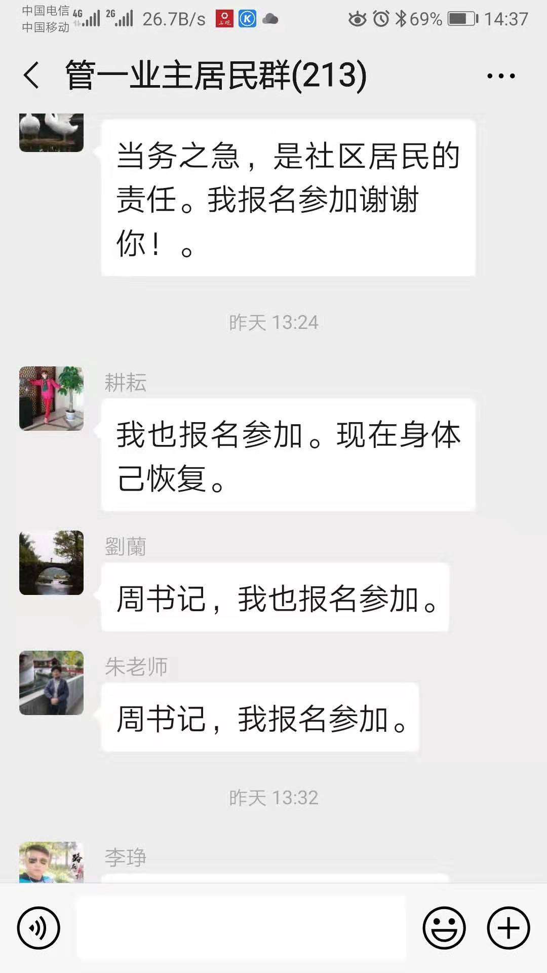鉴于此疲劳战一时未有尽期,为确保长期战斗力,周振文决定在业主群发动小区居民参与社区疫情防控的志愿服务工作。这天中午,消息一经发出,还不到半天就有40多位居民主动在微信群或者到居委报名。