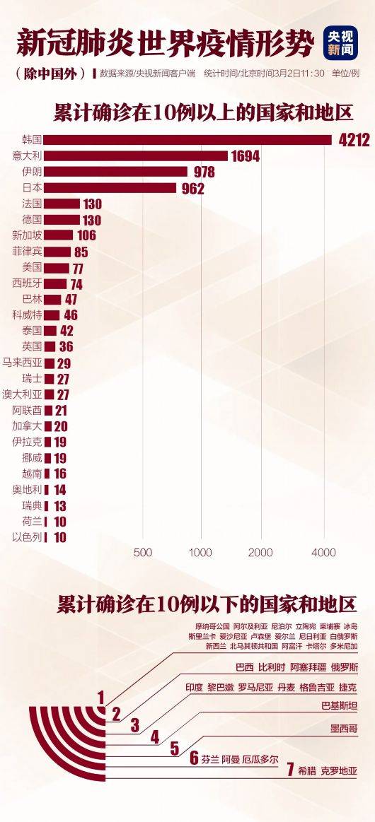 新冠肺炎疫情近日持续在多国蔓延,日本、韩国、伊朗等国确诊病例持续增加。当地时间3月1日,世卫组织发布最新一期新冠肺炎情况每日报告:截至北京时间1日17时,中国境外共58个国家确诊新冠肺炎7169例,死亡共计104例,与前一日相比新增1160例。