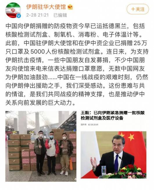 对此,@伊朗驻华大使馆回应:“中国在一线战疫的艰难时刻,仍然向伊朗伸出援助之手,我们深受感动。”