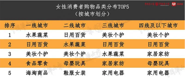 值得一提的是,在新电商时代,由于购物渠道和购物方式逐渐趋同,城乡女性的消费观念、消费习惯的差异也正在减小。从调研中可以发现,现在不论女性消费者身在哪里,都共享对水果蔬菜、美妆个护、日用百货商品的爱。特别是新电商平台平价优质的化妆品供应增多,进一步带动了三四线城市女性的“悦己”消费。