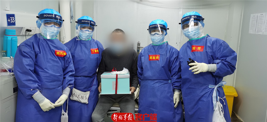 殷爷爷是前几天新入院的,原本性格急躁、不太愿意交流的他,初进感染五科隔离病房时,还万般抵触和挑剔。可他万万没想到,入院第二天科室医护人员为他过了个终生难忘的80大寿。一大早,在徐习护士长的带领下,白班护士热情地向他问候“生日快乐”,晚班护士带着医疗队领导送来生日蛋糕和慰问品,来到床边为他唱起了生日快乐歌。殷爷爷吃一口甜甜的蛋糕,想起住院以来医护人员对他的包容和关怀,既高兴、又愧疚,泪水模糊了双眼,同护士们一起,哼起了欢快的生日歌。