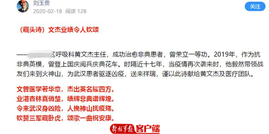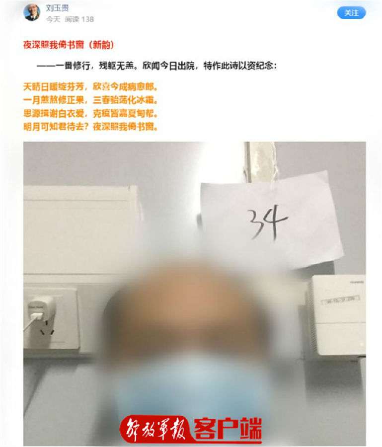 经过规范的治疗和精心的护理,越来越多的病人康复出院。34床的刘老师几天都睡不着觉,他连夜创作了好多首真情流露的诗,献给为他带来第二次生命的医生和护士们。出院之际,一句“思源揖谢白衣爱,克疫皆嘉蔡甸帮”,由衷道出了军民、医患之间的鱼水深情。