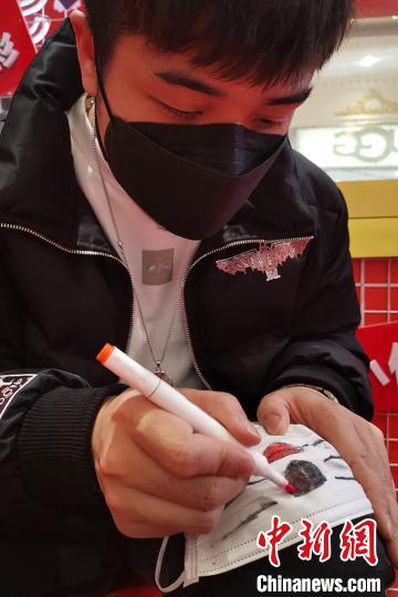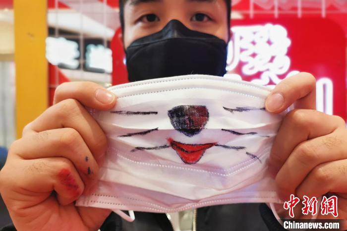 在口罩上绘笑脸。 羊栋泽 摄