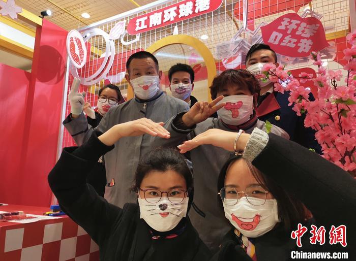 江南环球港员工戴着他们手绘的“微笑口罩”拍摄照片。 羊栋泽 摄