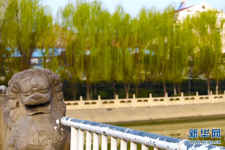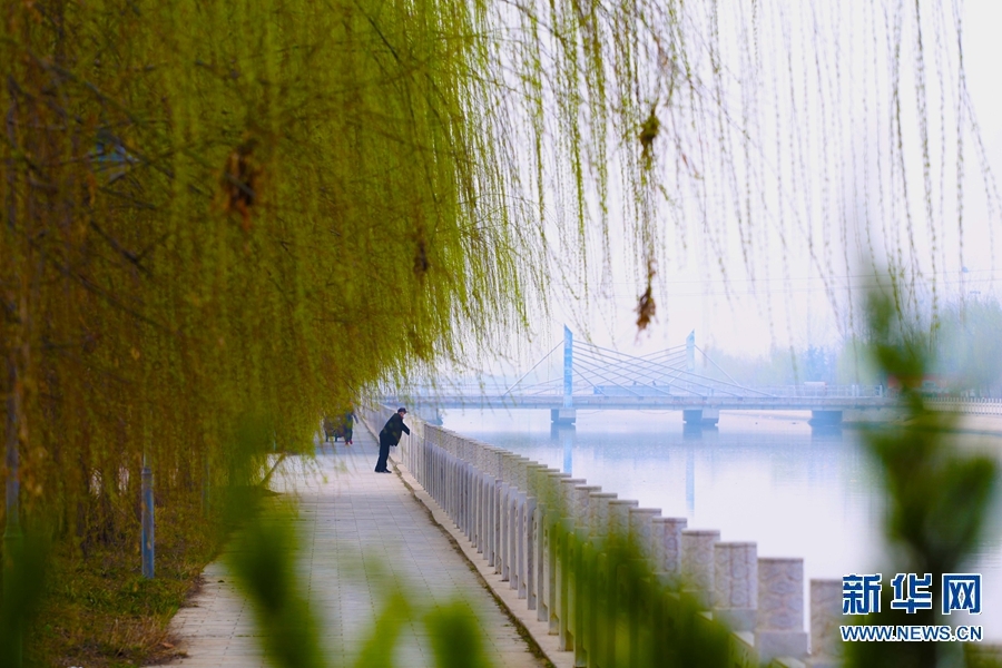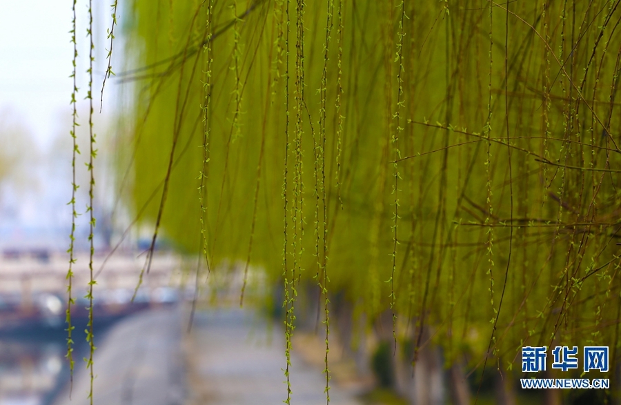 近日,随着温度升高,民权县城随处可见的柳树发出新芽,碧绿的柳条垂向地面,春风拂过,哗哗作响,呈献出勃勃生机。新华网发(马玉 摄)