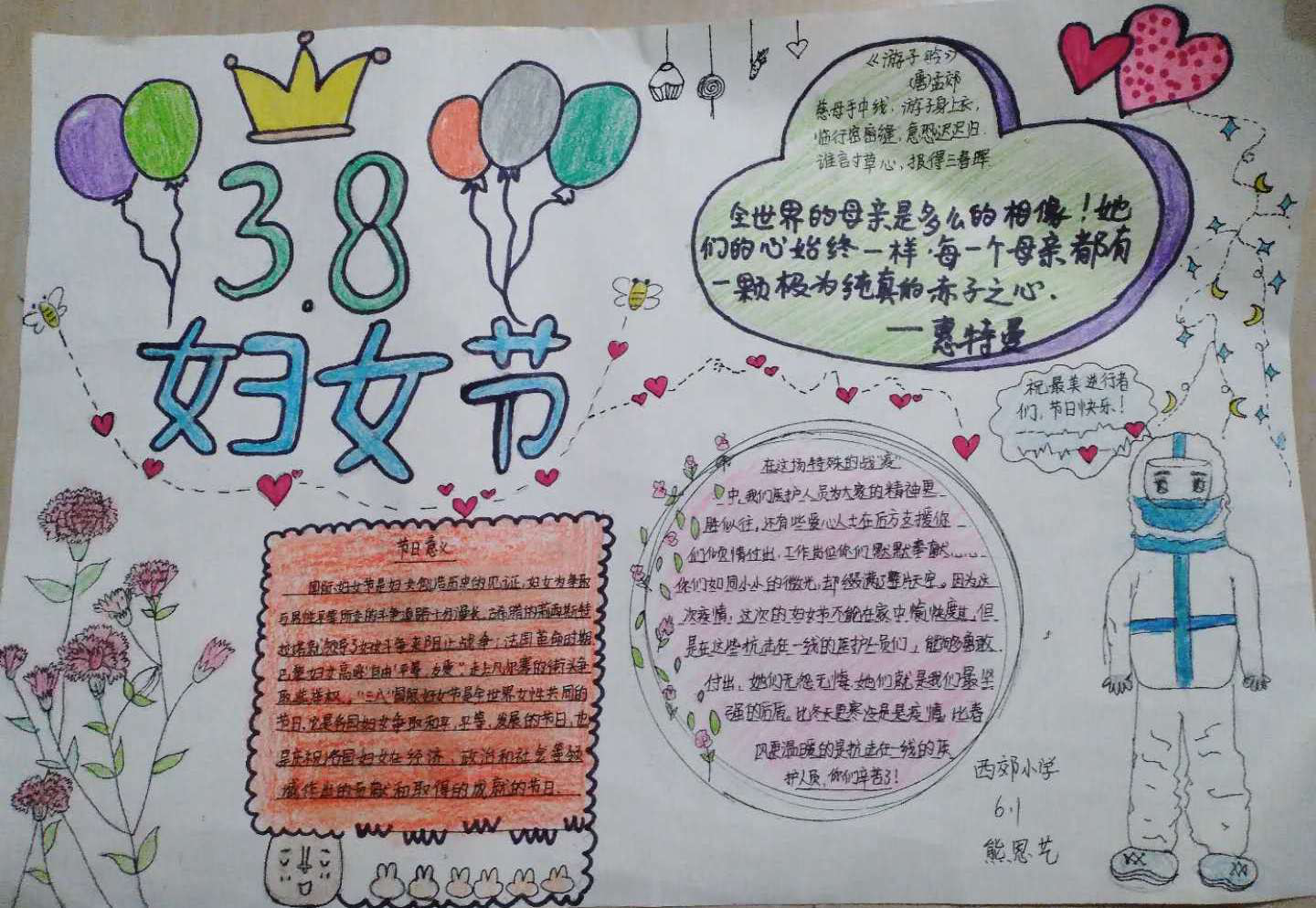 在疫情防控阻击战的战场上,巾帼不让须眉,她们勇敢担负起守护家园、守护人民的重任,守护着千家万户的幸福与安康,用最美逆行践行着家国情怀。队员们笔尖呈现出的一张张精美手抄报、一首首温情的诗歌表达出对最美逆行者的敬佩与感激之情,这是献给她们最好的节日礼物。