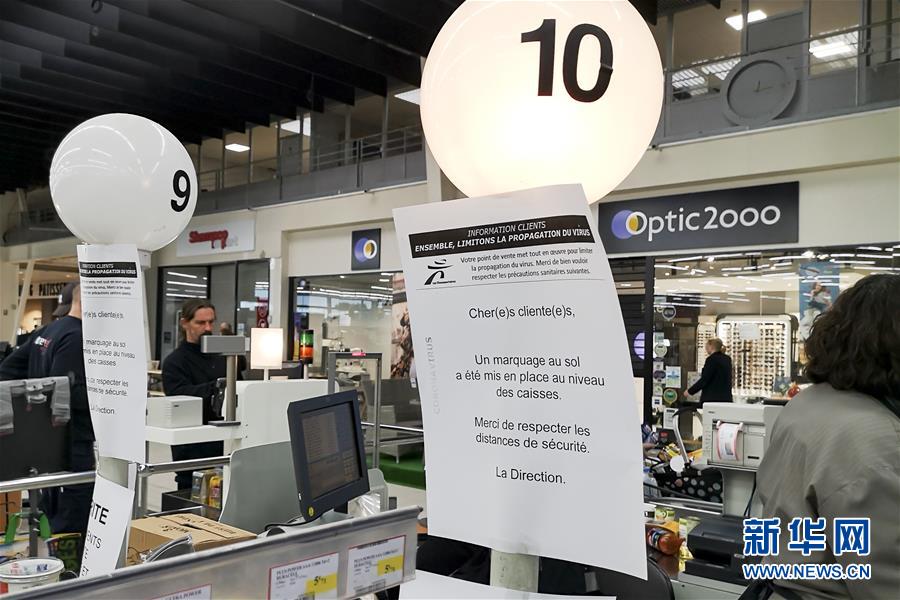 3月16日法国新冠肺炎患者较昨日新增1210例,累计确诊共6633例,其中死亡148例。图为:3月16日,在法国北部城市里尔,超市收银台贴着提醒人们保持安全距离的标识。(图片来源:新华网)
