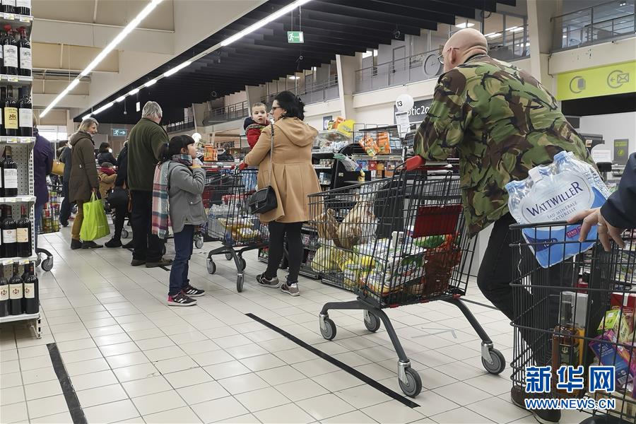 3月16日,在法国北部城市里尔,人们在超市排队结账。
