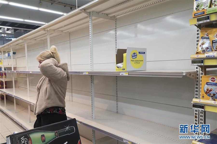 3月16日,在法国北部城市里尔,一家超市的卫生纸货架剩下零星商品。