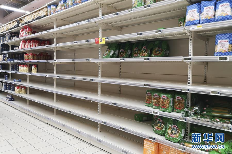 3月16日,在法国北部城市里尔,一家超市意面货架剩下零星商品。