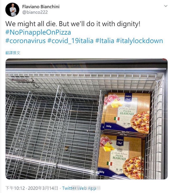 而前几日,社交媒体上热转的一张图片则是冷冻披萨货柜中空空荡荡,唯有菠萝披萨无人问津,发出图片的意大利人写道,“我们也许会死,但我们也会死得有尊严。披萨上不能有菠萝!”