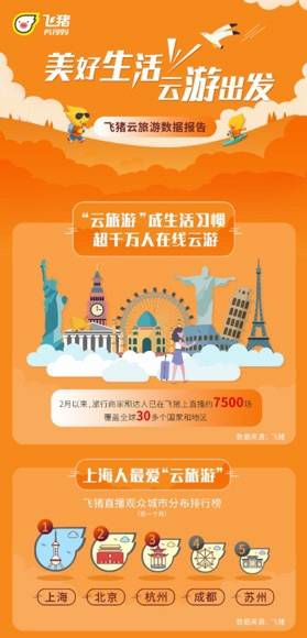 哪些人最爱云旅游?飞猪数据显示,近一个月以来,上海是全国观看飞猪旅游直播人数最多的城市,成为“云旅游”头号玩家。其次是北京、杭州、成都和苏州,妥妥的南方人更爱玩。上海人云游最喜欢文化悠久的国家,追求诗和远方的热情满满。太原是全国最喜欢看落日的城市。厦门观众最少年,观看直播的厦门粉丝中,00后占比全国第一。