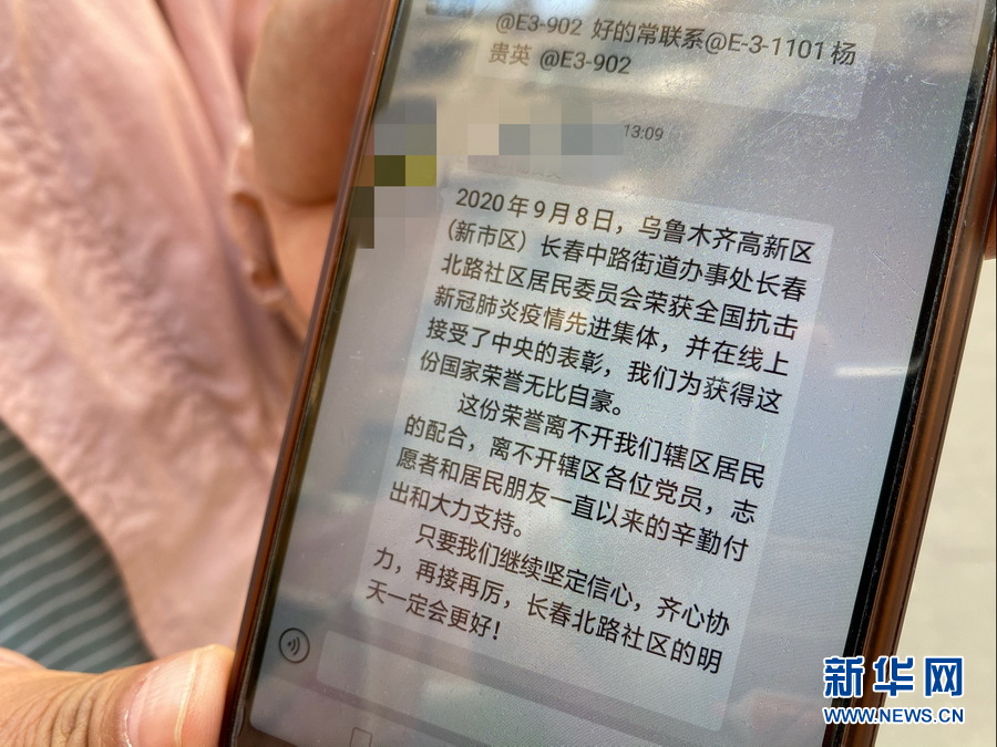 工作人员在居民联系群内感谢居民的理解和支持。新华网 盛元 摄