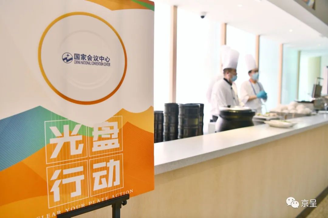 核心场馆国家会议中心倡导光盘行动,每个餐饮点都设置了海报,服务人员会提示用餐客人适量取餐。国家会议中心大酒店餐饮区每两小时进行通风、消毒,每天对玻璃、瓷器、银器餐具进行快速检测,所有服务人员均配戴口罩、手套,并尽量为客人提供无接触式服务。