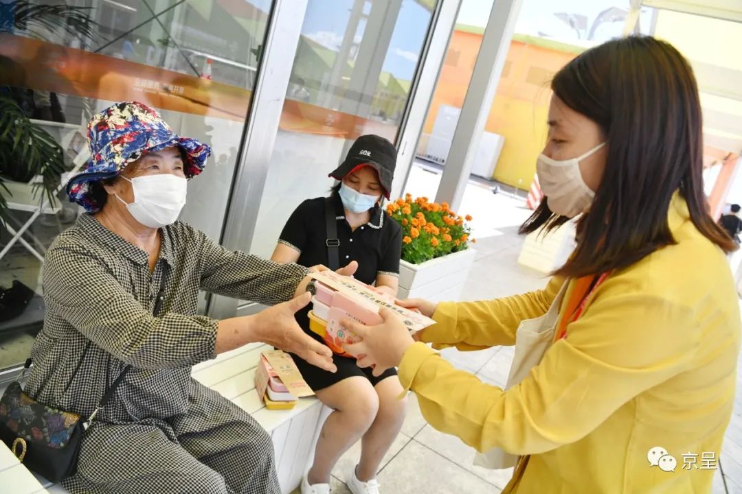 服贸会室外展区丰台文化展台工作人员将多订的备用盒饭送给有需要的观众,避免浪费。