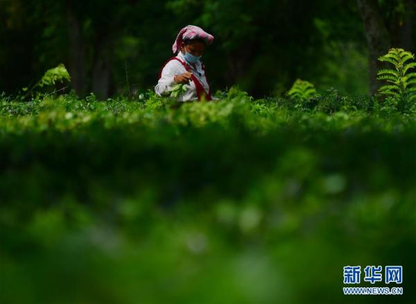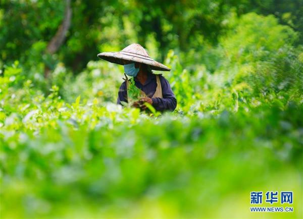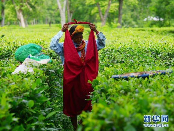 9月8日,在印度特里普拉邦首府阿加尔塔拉郊外,工人在茶园里采茶。 新华社发