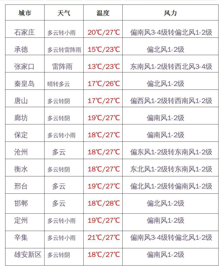 今天夜间,张家口、承德、保定、雄安新区、廊坊西部、石家庄、邢台北部、沧州西部、衡水西部多云转阴有阵雨或雷阵雨 ,其他地区多云。